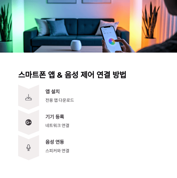 스마트폰에 조명 제조사에서 제공하는 전용 앱을 설치하고 필요시 구글 홈, 애플 홈킷, 아마존 알렉사 등 스마트홈 허브 앱도 함께 설치해두는 것이 좋습니다.