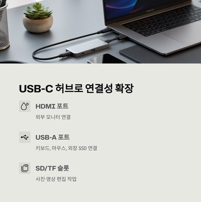 HDMI 외부 모니터 연결 USB-A 3개 키보드, 마우스, 외장 SSD SD/TF 슬롯 사진·영상 편집 사용자 핵심: USB-C 허브는 노트북의 연결성을 완전히 확장해줍니다.