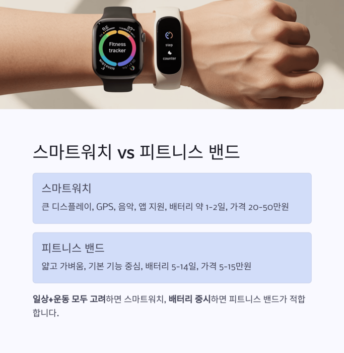 운동 특화와 배터리를 중시한다면 피트니스 밴드가 적합합니다.
