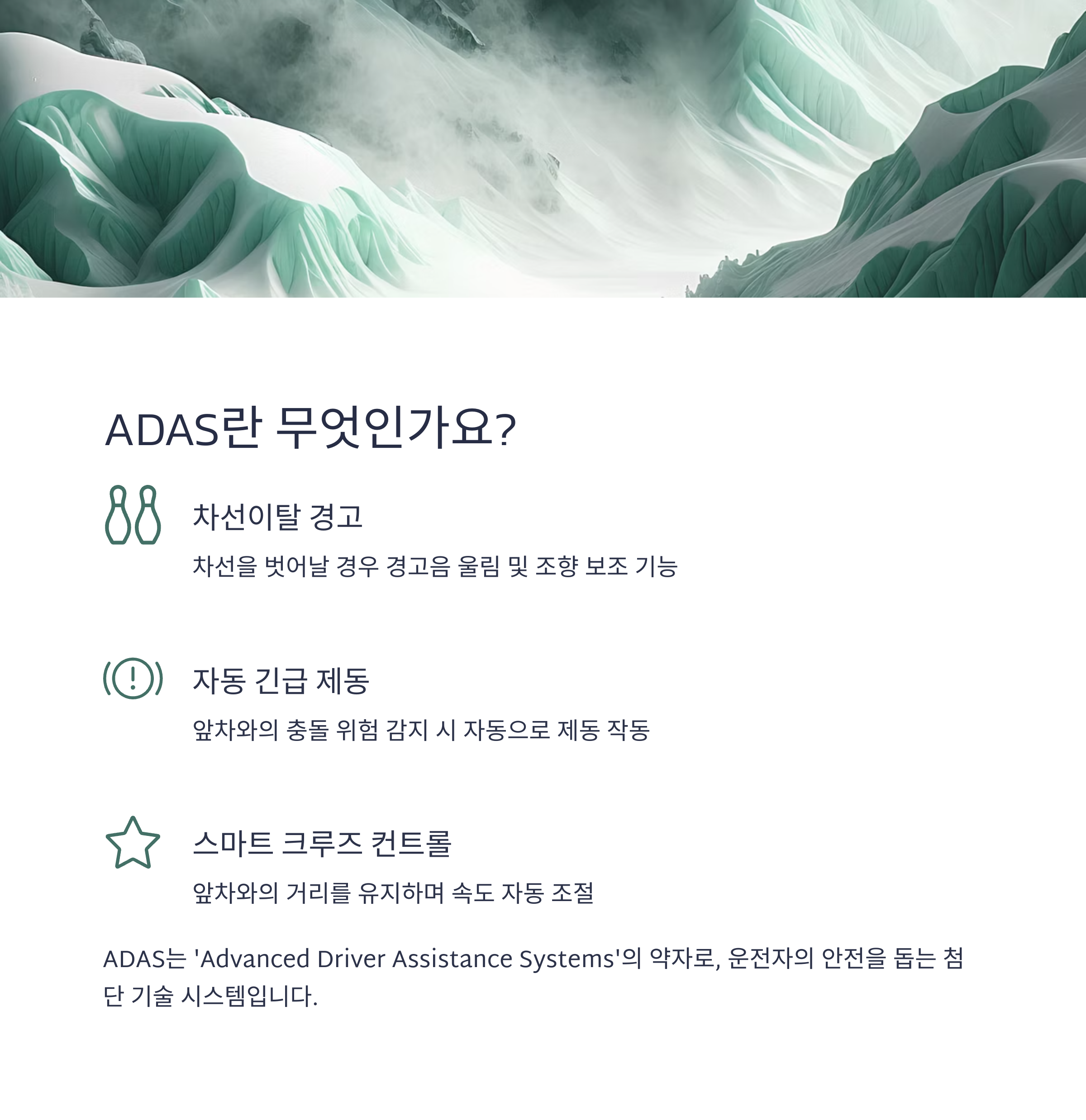 ADAS는 ‘Advanced Driver Assistance Systems’의 약자로, 운전자의 안전을 돕기
