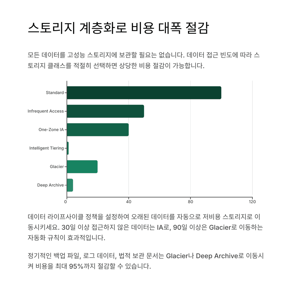 Infrequent Access, Archive로 옮기면 대폭 비용 절감이 가능합니다.스토리지 유형 비용 수준 접근 빈도 예시 활용